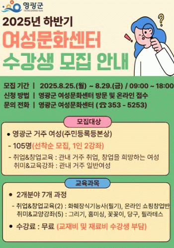 접수는 8월 25일부터 29일까지 [영광군 홈페이지]를 통한 온라인 신청과 [영광군 여성문화센터]에 방문 신청할 수 있으며, 1인당 최대 2과정까지 과정별 선착순으로 접수한다.