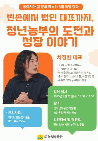 그는 직접 농사를 지으며 마주한 현실과 한계를 넘어서는 도전, 청년 세대가 바라보는 농업의 비전과 기회를 생생한 경험담으로 들려줄 예정이다.