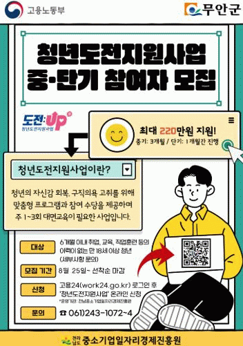 모집 대상은 6개월 이내 고용보험 가입 및 사업체 운영, 교육, 직업훈련 등의 이력이 없는 만 18세~34세의 미취업 청년으로, 무안군 조례상 청년으로 정의되는 만 45세 이하의 군민도 참여할 수 있으며, 신청은 고용24 누리집을 이용하거나, 전남일자리종합센터으로 문의하면 된다.