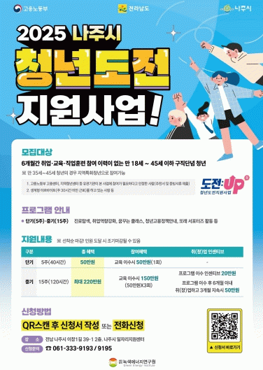시 관계자는 “청년도전 지원사업은 나주 청년들의 자립과 사회 진입을 지원하는 맞춤형 프로그램”이라며 “많은 청년이 기회를 놓치지 않고 참여하기를 바란다”고 말했다.