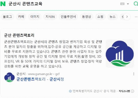 이를 통해 ▲군산 도심여행 ▲군산시 시민정보화 ▲군산시 콘텐츠팩토리와 같은 구체적인 키워드만 검색하면, 별도의 누리집 접속 없이 검색 결과 첫 화면에서 신청 방법 등 요약된 정보가 바로 뜬다.
