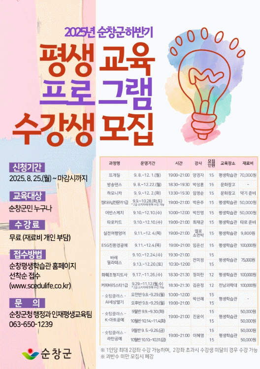 신청은 순창군 평생교육 홈페이지가능하며, 문의는 순창군청 행정과로 하면 된다.