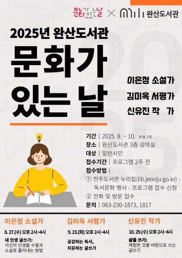 먼저 오는 27일에는 이은정 소설가가 ‘내 인생 글쓰기’를 주제로 자신의 삶을 수필과 소설로 풀어내는 방법을 소개하며, 이어 오는 9월에는 김미옥 서평가가 ‘공감하는 독서, 치유하는 글쓰기’를 통해 독서와 글쓰기가 지닌 치유적 가치를 조명한다.