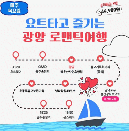 투어 일정은 ▲유스퀘어(8:20) ▲송정역(8:50) ▲백운산자연휴양림 ▲불고기특화거리 ▲망덕포구 요트 체험 ▲남파랑길 49코스 ▲윤동주 유고 보존 가옥을 거쳐 ▲송정역(18:25) ▲유스퀘어(18:50)로 돌아오는 코스다.