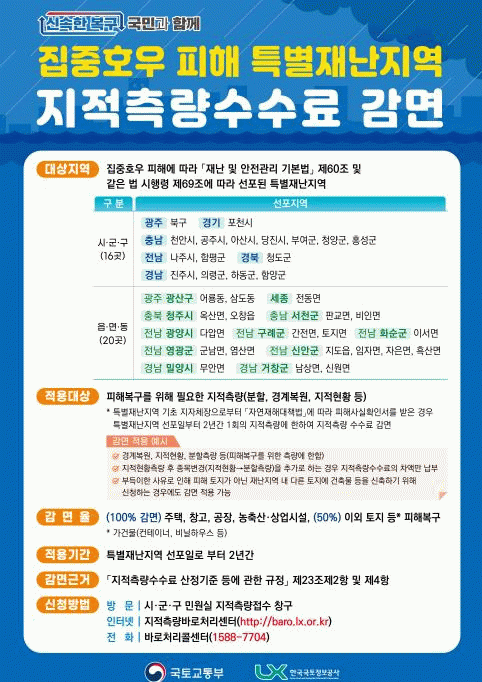 지원 대상은 한국국토정보공사(LX)에 지적측량을 의뢰하는 피해 주민으로 ‘피해사실확인서’를 제출하면 주거용 주택은 100%, 토지와 컨테이너, 비닐하우스 등 가설건축물은 50%를 감면받을 수 있다.