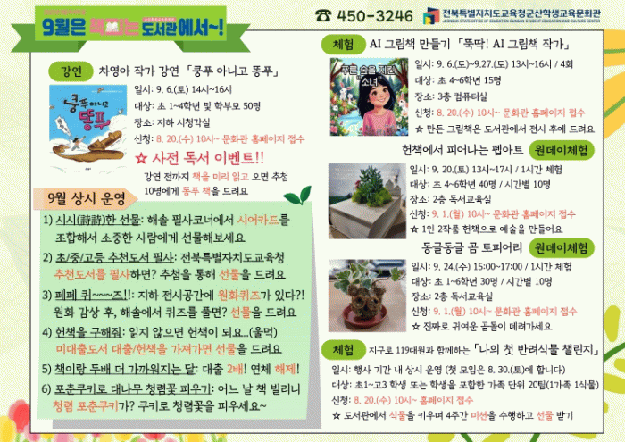 이 행사는 ‘9월은 책 피는 도서관(군산학생교육문화관)에서’를 주제로 강연과 체험 등 11개 프로그램을 선보일 예정이다.