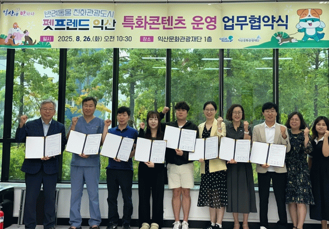 익산시는 26일 익산문화관광재단(대표이사 김세만), 지역 청년 창업가, 전문 의료기관, 관련 단체와 함께 '반려동물 관광 특화콘텐츠 공동추진'을 위한 업무협약을 체결했다.