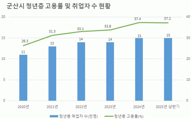 지난 21일 통계청이 발표한 ‘2025년 상반기 지역별 고용조사’에 따르면, 군산시 2025년 상반기 고용률은 59.7%로 전년 동기 대비 1.6%p 증가했으며 취업자 수도 전년 동기와 비교해 4,000명이 증가한 13만 9,000명을 기록한 것으로 나타났다.