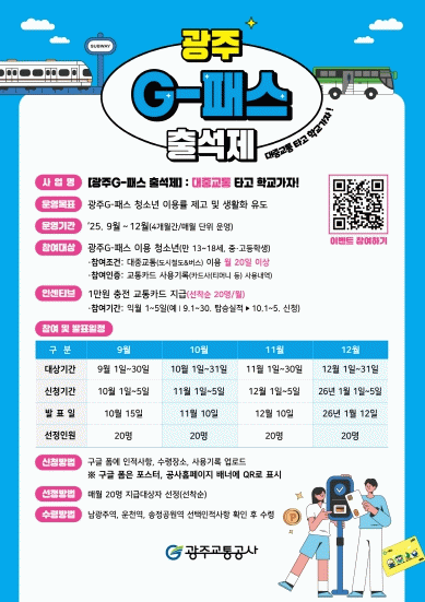 이번 이벤트는 평소 교통카드를 사용해 월 20일 이상 대중교통을 이용하는 만 13세 이상 18세 미만 청소년이 참여할 수 있으며, 참가 희망 인원은 공사 누리집 또는 각 역사에 게시된 포스터의 정보무늬(QR코드)를 통해 신청하면 된다.