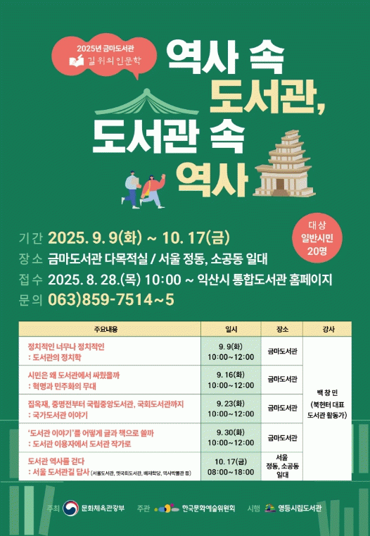 강연은 백창민 북헌터 대표가 강사로 나서 △도서관의 정치학 △혁명의 무대, 도서관 △집옥재·중명전·국립중앙도서관 등 국가도서관 △도서관 이용자에서 작가로 등 4개 주제로 진행된다.