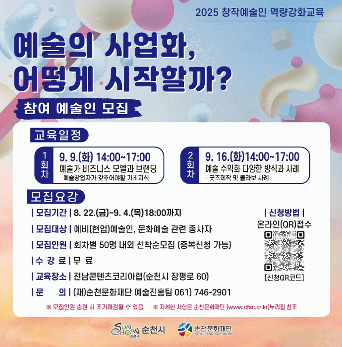 자세한 내용은 순천문화재단 누리집 공고문에서 확인 가능하며, (재)순천문화재단 예술진흥팀으로 문의하면 된다.