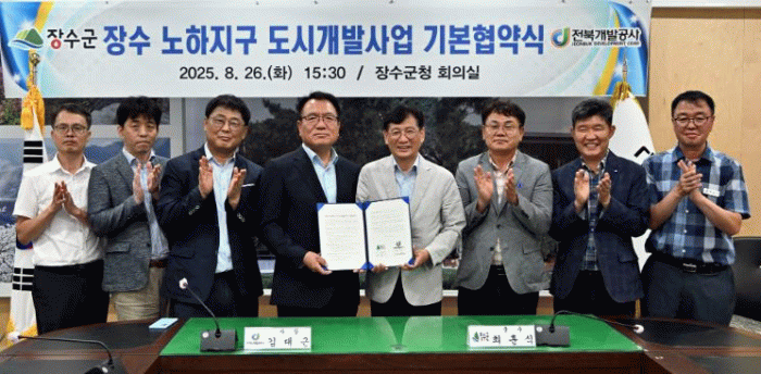 장수군은 지난 26일 군청 2층 회의실에서 최훈식 장수군수와 김대근 전북개발공사 사장 등 양 기관의 관계자들이 참석한 가운데 공동사업시행자인 전북개발공사와 ‘장수군 노하지구 도시개발사업’ 추진을 위한 기본협약을 체결했다.