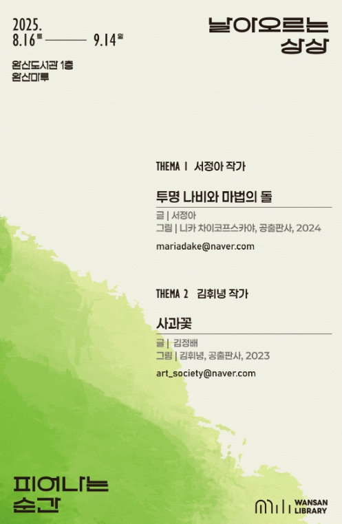 이번 전시에서는 김휘녕 작가(그림)의 그림책 ‘사과꽃’(김정배 글)과 서정아 작가(글)의 ‘투명나비와 마법의 돌’(니카 차이코프스카야 그림)에 수록된 일러스트 50여 점이 전시돼 관람객들은 그림책을 통해 ‘피어나는’ 따뜻한 이야기와 ‘날아오르는 상상’의 자유를 시각적으로 경험할 수 있다.