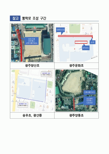 내년 1월까지는 광산구와 함께 지난해 선정된 ‘우산동 뉴빌리지 사업’의 하나로 송우초등학교와 광산중학교 일대에 통학로를 조성한다. 광산중과 송우초 남쪽부분의 협소한 통학로를 확대하고, 송우초 동편은 보도를 신설한다.