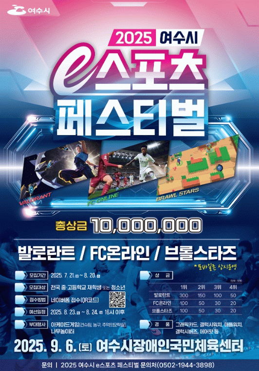 이번 대회는 공인 e스포츠 심판과 전문 캐스터의 진행으로 공정성과 현장감을 더하며 종목별 1~4위에는 시장상장과 총상금 1,000만 원이 수여된다.