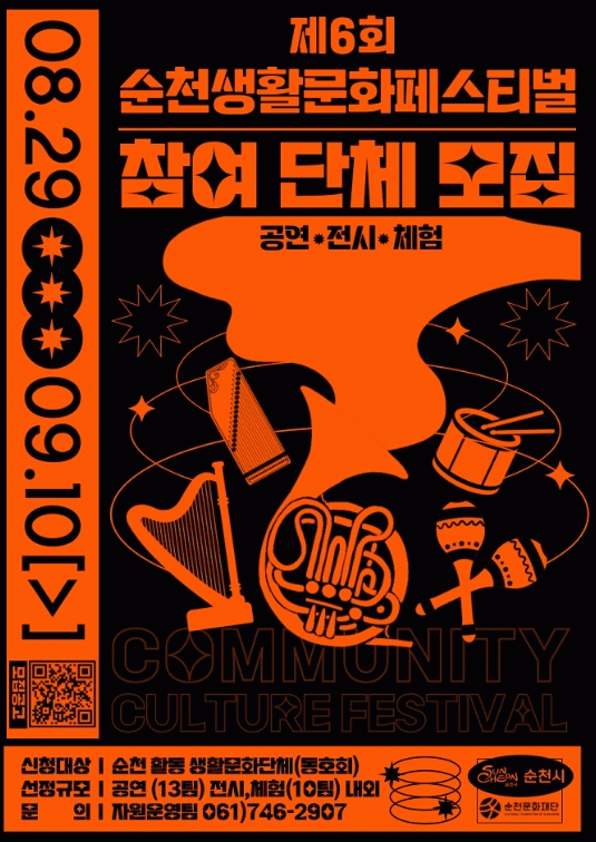 보다 자세한 내용은 순천문화재단 누리집 공고문에서 확인할 수 있으며 순천문화재단 자원운영팀으로 문의하면 된다.