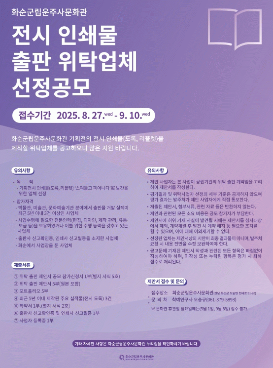 또한 출판사 신고확인증과 인쇄사 신고필증을 모두 소지하고, 화순군에 사업장을 둔 업체만 참여할 수 있다.