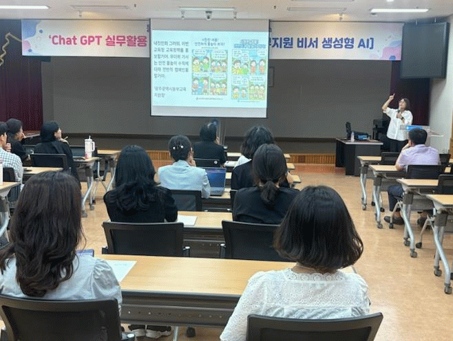 교육은 광주동명중학교 박혜인 교사가 ‘스마트업무지원 비서, 생성형 AI’를 주제로 강의와 실습을 병행하는 방식으로 진행됐다.