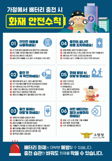 이에따라 반드시 기억해야 할 사고 예방법은▷배게 아래, 침대 및 소파 위에서 제품 충전 금지▷충전 완료 후, 코드를 뽑거나 배터리 연결선 제거▷고용량 배터리 충전은 벽면 콘센트에 직접 연결▷과충전 또는 방전상태 확인▷안전장치가 장착된 인증(KC)제품 사용 등이 있다.