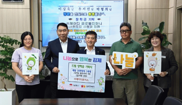 시에 따르면 지난 28일 ㈜제이디로지스 이상욱 대표와 ,(사)위드인사람과함께 김대호대표가 정성주 김제시장이 참석한 가운데 취약계층 아동·청소년을 위한 후원 협약식과 드림장학금 전달식을 가졌다.