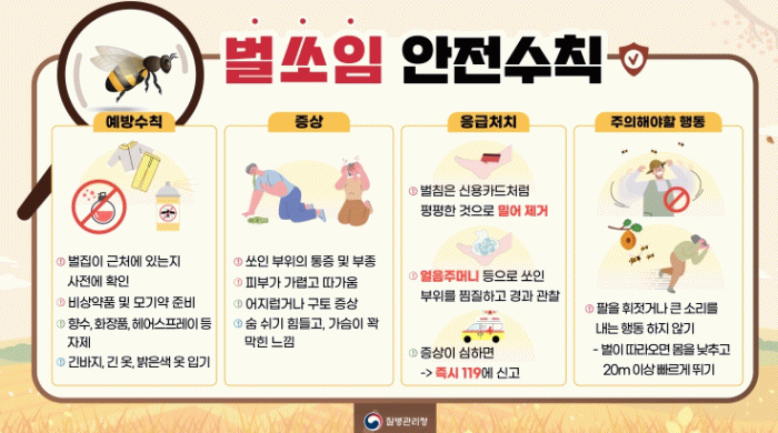 벌 사고 예방을 위해서는 벌집 위치를 사전에 확인하고 밝은색 긴 옷을 착용하며 향수나 화장품 사용을 자제하는 게 좋다.
