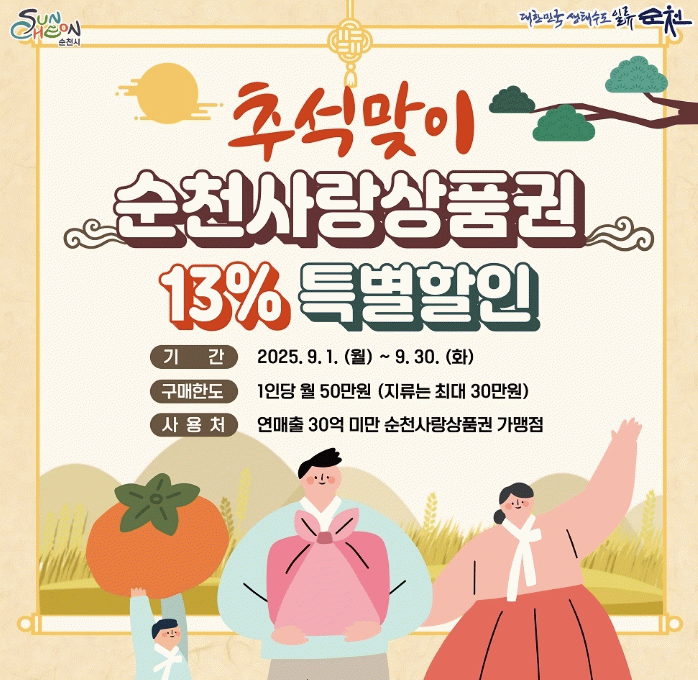 시 관계자는 “다가오는 명절을 맞아 전통시장과 골목상권에서 순천사랑상품권을 적극 활용해 주시길 부탁드린다”며 “이번 특별할인을 통해 따뜻하고 넉넉한 명절을 준비하시길 바란다”고 말했다.