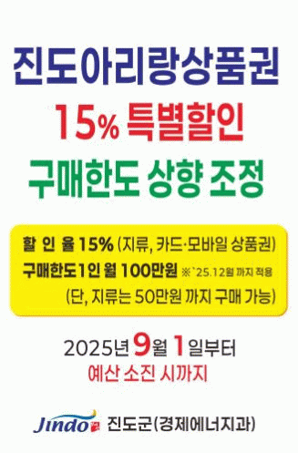 김희수 진도군수는 “이번 특별 할인을 통해 전통시장과 상가 가맹점에서 사용할 수 있는 진도아리랑상품권이 지역경제의 선순환 효과를 가져오고, 지역 내 추가 소비를 촉진해 지역경제 활성화에도 이바지할 수 있을 것”이라고 말했다.
