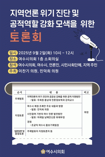주제발표는 우희창 충남대학교 언론정보학과 강의교수가 맡아 ‘지역언론의 위기 진단과 공공성 강화를 위한 공적 지원 방안’을 제시하며, 이어지는 지정토론에서는 민덕희 의원이 ‘여수시 지역언론 발전지원 조례안’의 주요 내용과 추진 방향을, 마재일 남해안신문 취재부장이 ‘시민 참여 기반의 여수언론 발전방안’을 발표한다.