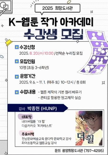 장혜정 광양희망도서관 팀장은 “하반기 프로그램은 책, 예술, 디지털을 넘나들며 어린이들이 창의력과 표현력을 기르고 미래 진로를 탐색하는 기회가 될 것”이라며 “현직 예술가와 전문가와의 만남을 통해 지역 아동들이 문화적 자신감과 성취감을 쌓기를 기대한다”고 말했다.