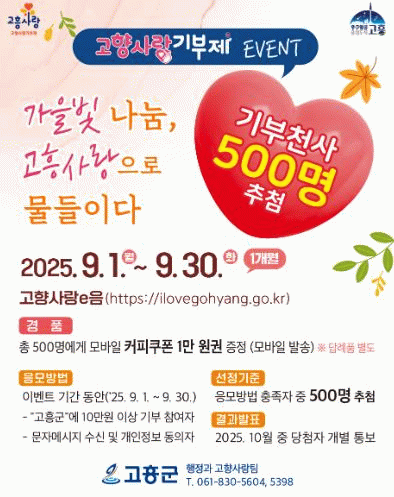 이번 이벤트는 9월 1일부터 30일까지 진행되며, 고흥군에 10만 원 이상 기부하고 문자 수신에 동의한 참여자는 자동으로 응모된다.