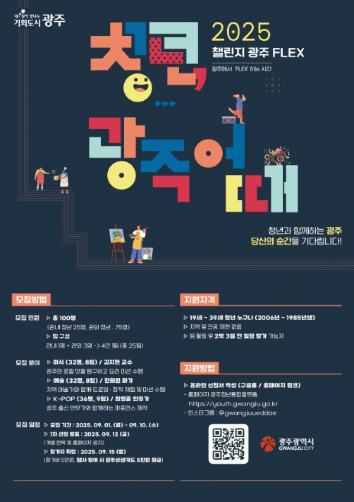 행사 기간에는 ‘2025 광주청년주간’과 광주청년센터 주관 ‘청년교류총회’가 함께 열려 지역 청년들과 교류 기회도 마련된다.