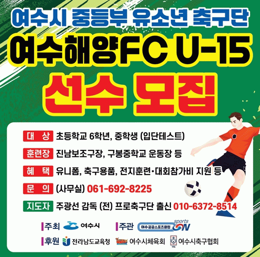 관심 있는 축구 꿈나무와 학부모는 여수공공스포츠클럽으로 문의하면 된다.