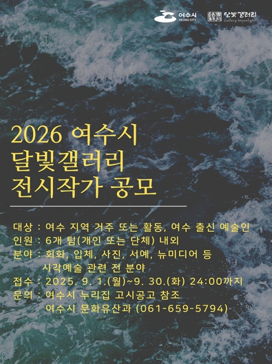 여수시 관계자는 “달빛갤러리가 지역 예술인들의 창작 무대이자 시민들의 문화 향유 공간으로 자리매김할 수 있도록 최선을 다하겠다”며 “지역의 다양한 분야에서 활동하는 역량 있는 예술인들의 많은 관심과 참여를 기대한다”고 말했다.