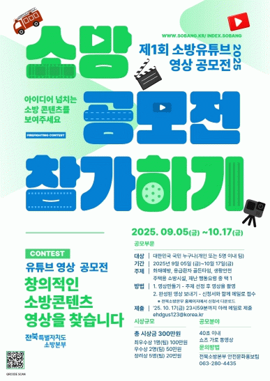 주제는 ▲화재예방 ▲응급환자 골든타임 확보 ▲생활안전 ▲주택용 소방시설 ▲재난 행동요령 중 하나를 선택해 자유롭게 구성하면 된다. 참가를 원하는 사람은 9월 5일부터 10월 17일까지 이메일로 영상 파일과 신청서류를 제출하면 되며, 신청서 양식은 전북특별자치도소방본부 공식 홈페이지에서 내려받을 수 있다.
