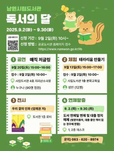 최경식 남원시장은 “독서의 달을 맞아 다양한 문화행사를 준비한만큼 시민들이 도서관에서 다채롭고 풍요로운 9월을 보내길 바란다”라고 말했다.
