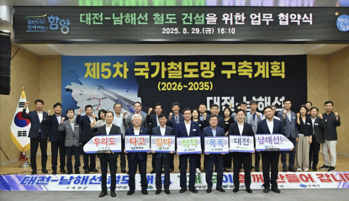 이날 경과보고와 협약서 서명, 공동건의문 채택, 상징퍼포먼스, 기념촬영 등의 순으로 진행된 협약은 ‘대전~남해선 철도건설 사업’의 원활한 추진과 정부의 제5차 국가철도망 구축계획 반영을 위해 추진됐다.