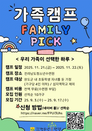 캠프는 전액 무료로 진행되며 공동체활동 · 모험활동,공예활동 등 다양한 프로그램이 진행 될 예정이며, 모집대상은 완도군내 초등학생 자녀를 둔(4인이하) 가족이다.