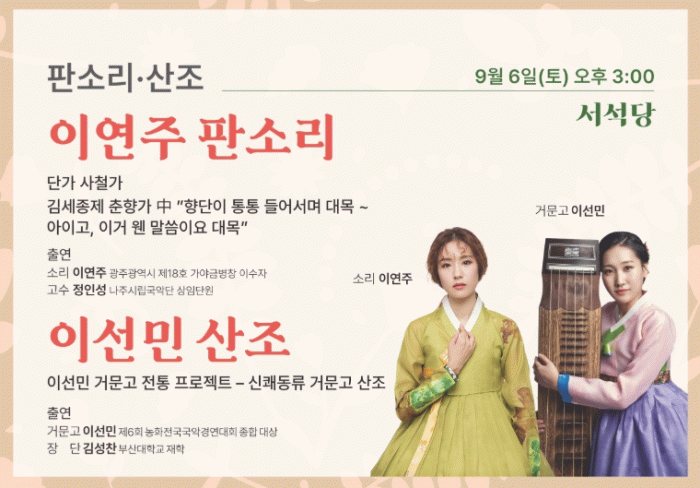두 번째 무대는 소리꾼 이연주의 판소리 '춘향가'다. 이연주는 중앙대학교 일반대학원 한국음악학과에서 판소리를 전공했으며, 진도군립민속예술단 상임단원을 역임했다. 현재는 광주광역시 제18호 가야금병창 이수자로 활동하며, 판소리와 가야금병창을 아우르는 폭넓은 예술적 스펙트럼을 보여주고 있다.