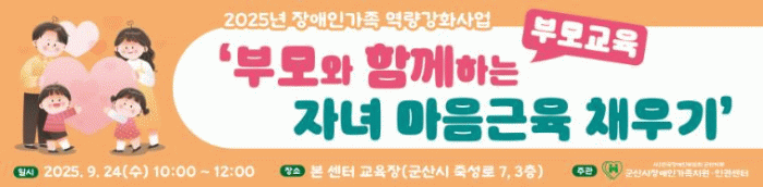 2025년 장애인가족 역량강화사업의 하나로 진행되는 이번 교육은 오는 24일 군산시장애인가족지원·인권센터 교육장에서 무료로 진행한다.