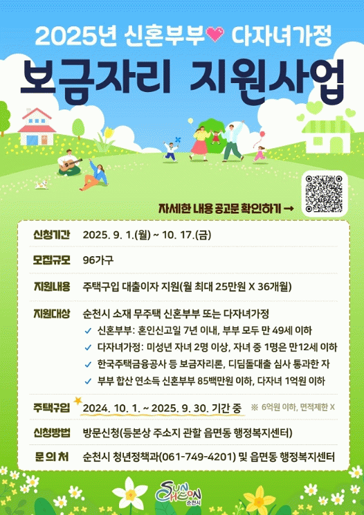 신청 대상은 한국주택금융공사 등의 보금자리론, 디딤돌 대출 심사를 통과해 2024년 10월 1일부터 2025년 9월 30일까지 순천시 소재 6억 원 이하 주택을 구입한 무주택 신혼부부와 다자녀가정이다.