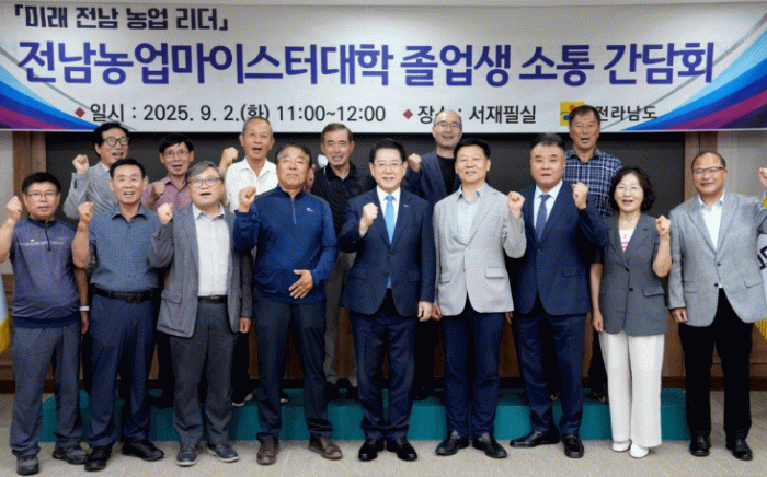 간담회에선 최구홍 전남농업마이스터대학 졸업생 회장을 비롯해 다양한 품목의 농업마이스터와 졸업생이 참석해 전남 농업의 지속 가능한 발전 방향을 논의하고, 전문농업경영인으로서 역할 강화를 다짐했다.