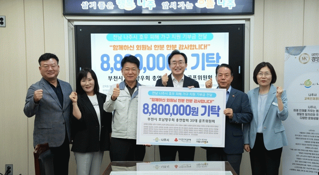 윤병태 나주시장은 “고향을 잊지 않고 따뜻한 정을 나눠주신 부천시 호남향우회 총연합회 35대 골프위원회 안병일 골프위원장과 회원분들께 깊이 감사드린다”며 “전달된 성금은 호우 피해 가구 지원에 소중히 사용하겠다”고 말했다.