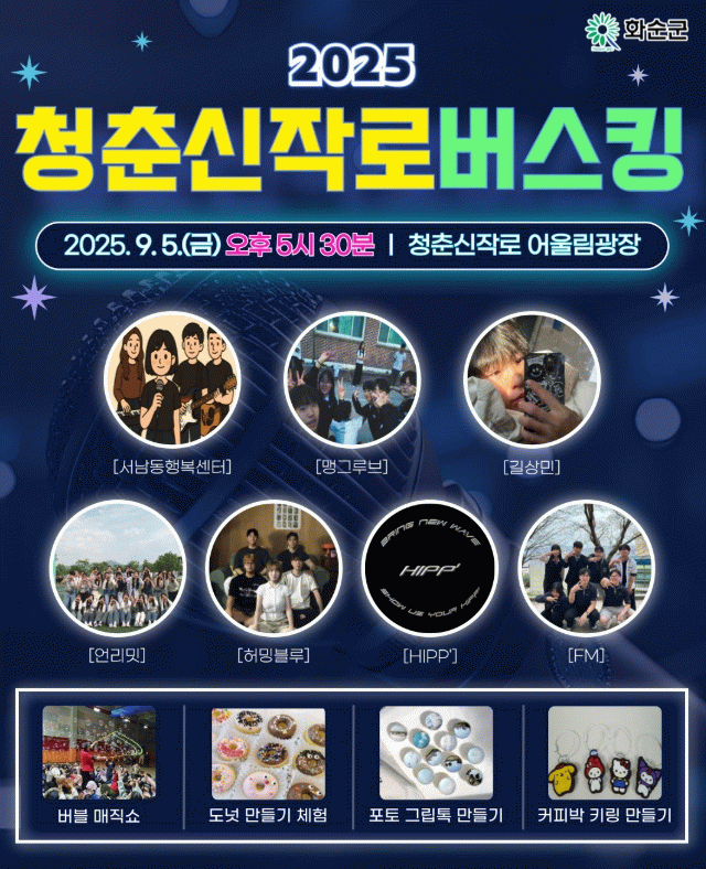 본 공연에 앞서 오후 5시 30분부터는 매직 버블쇼가 펼쳐져 아이들과 가족 단위 관객들의 흥미를 끌 예정이다. 공연 외에도 ▲도넛 만들기 체험 ▲포토 그립톡 만들기 ▲커피박 키링 만들기 체험 부스 등 다양한 부스가 운영되어 즐길 거리를 더한다.