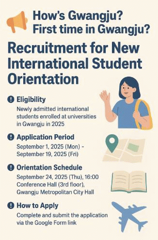 ‘광주 어때! 광주는 처음이지?’를 주제로 진행되는 이번 교육은 ▲광주생활 안내 ▲광주 주요 관광지 소개 ▲외국인 유학생 우수 활동사례 공유 등으로 구성되며, 분야별 전문가가 직접 강의를 맡는다.
