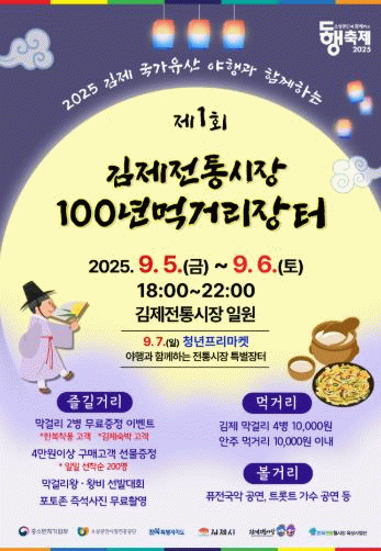 올해로 첫선을 보이는 김제전통시장 100년 먹거리장터는 지역주민과 방문객이 함께 참여하는 야간 먹거리 문화축제로 김제 국가유산 야행과 연계해 진행한다.
