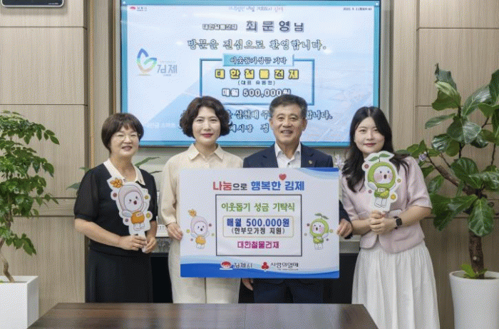 정성주 김제시장은 ” 지역의 어려운 가정을 위해 따듯한 나눔을 실천해 주신 대한철물건재에 깊이 감사드린다“며 ”김제시도 복지안전망을 더욱 강화하여 나눔과 배려가 살아 숨 쉬는 따뜻한 도시로 성장할 수 있도록 노력하겠다”고 밝혔다.