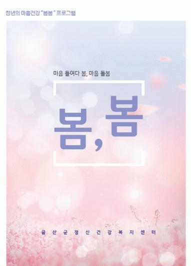 이 프로그램의 제목에는 ‘마음을 들여다 봄, 나를 돌봄’의 의미가 담겼으며 지역사회 내 우울감, 불안, 심리적인 어려움을 가지고 있는 청년 우울 고위험군의 정신질환과 자살을 예방하기 위해 추진된다.