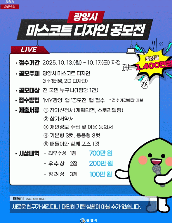 광양시 관계자는 “이번 공모전은 앞으로 광양시를 대표할 새로운 마스코트를 전 국민과 함께 만들어가는 과정”이라며 “시의 정체성과 상징성을 담은 독창적인 캐릭터가 선정될 수 있도록 많은 관심과 참여를 부탁드린다”고 말했다.