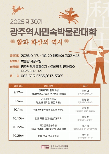 임찬혁 역사민속박물관장은 “이번 박물관대학은 기획전과 연계해 활과 화살의 기원을 폭넓게 이해할 수 있는 기회”라며 “시민들이 사냥·전쟁·스포츠·예술 등 다양한 분야에서 변화해 온 활과 화살의 의미를 깊이 알 수 있을 것으로 기대한다”고 말했다.