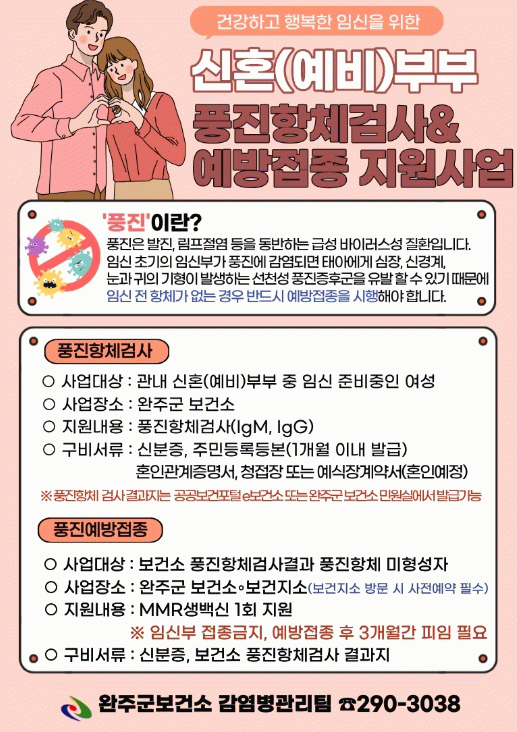 이번 사업은 관내 임신을 준비 중인 신혼(예비)부부 여성을 대상으로 진행되며, 보건소에서 풍진 항체검사(IgM, IgG)를 무료로 받을 수 있다,